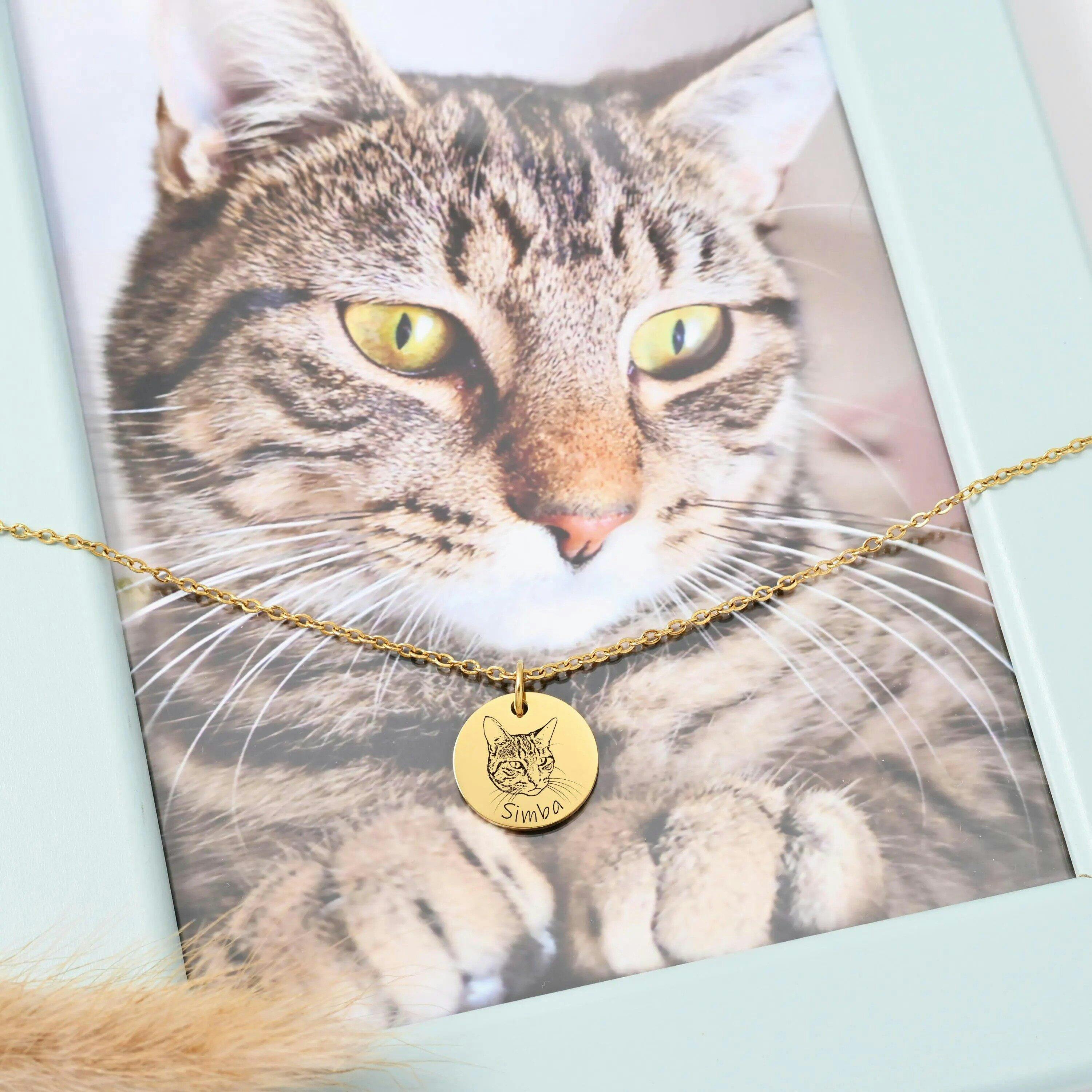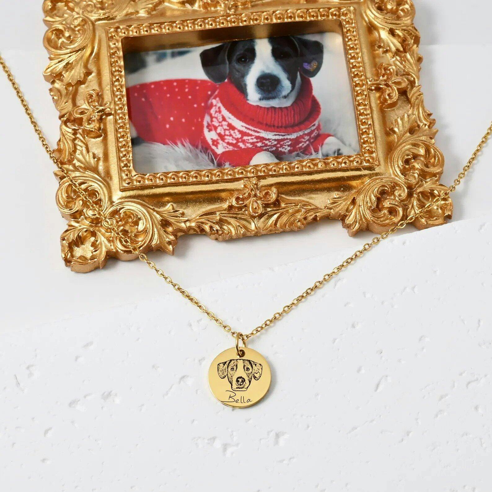 This custom pet portrait name necklace adds a unique touch to any outfit. Personalize with your pet's portrait and name to create a one-of-a-kind accessory. Handcrafted with precision and attention to detail, this necklace is a perfect way to show off your love for your furry friend.