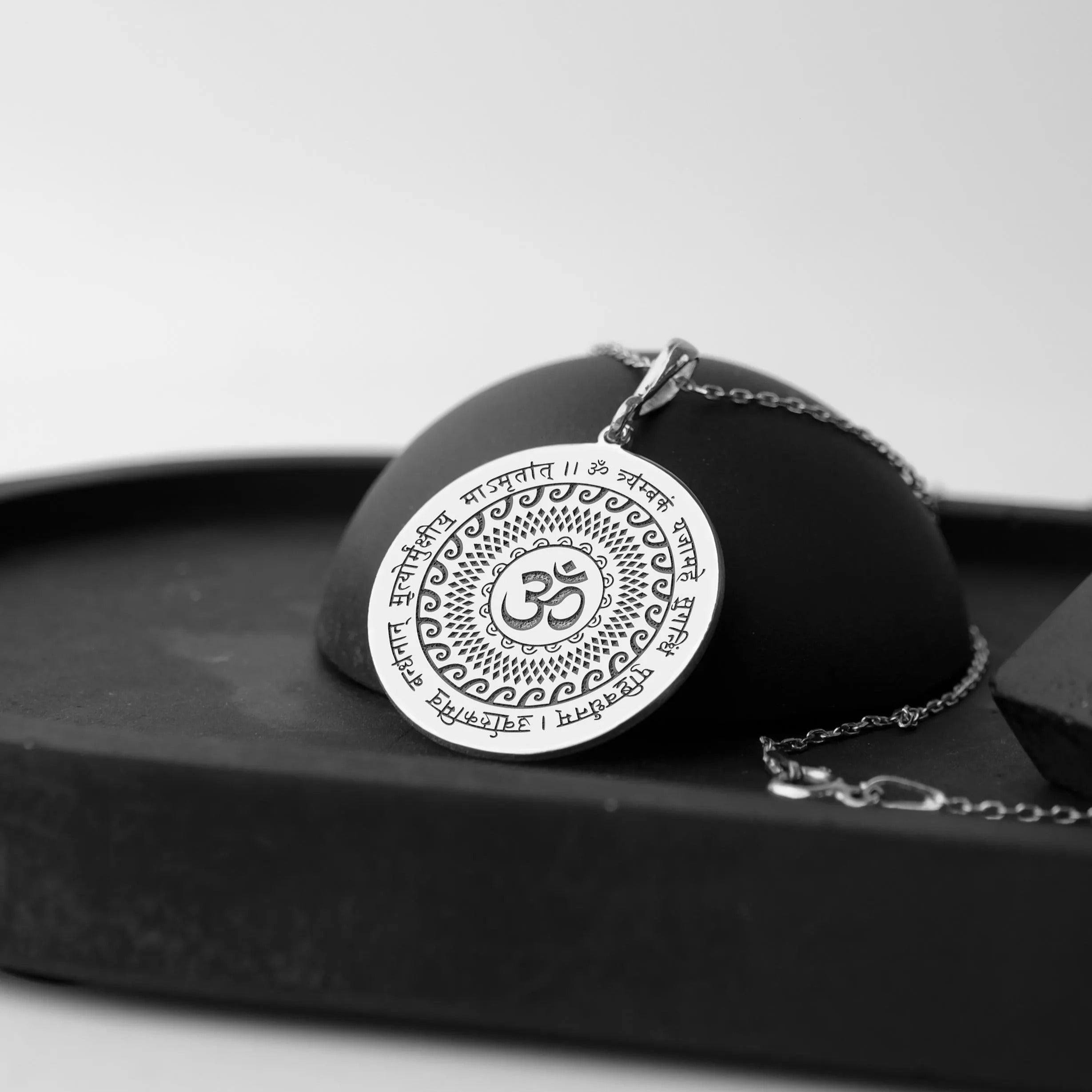 Embrace protection and positivity with the Maha Mrityunjaya Mantra Om Pendant. This meaningful pendant features the sacred Maha Mrityunjaya mantra, believed to bring healing, strength, and peace. Wearing it close serves as a constant reminder of resilience and spiritual support in daily life. Perfect for those seeking calm and balance, this pendant blends spiritual significance with elegant design.