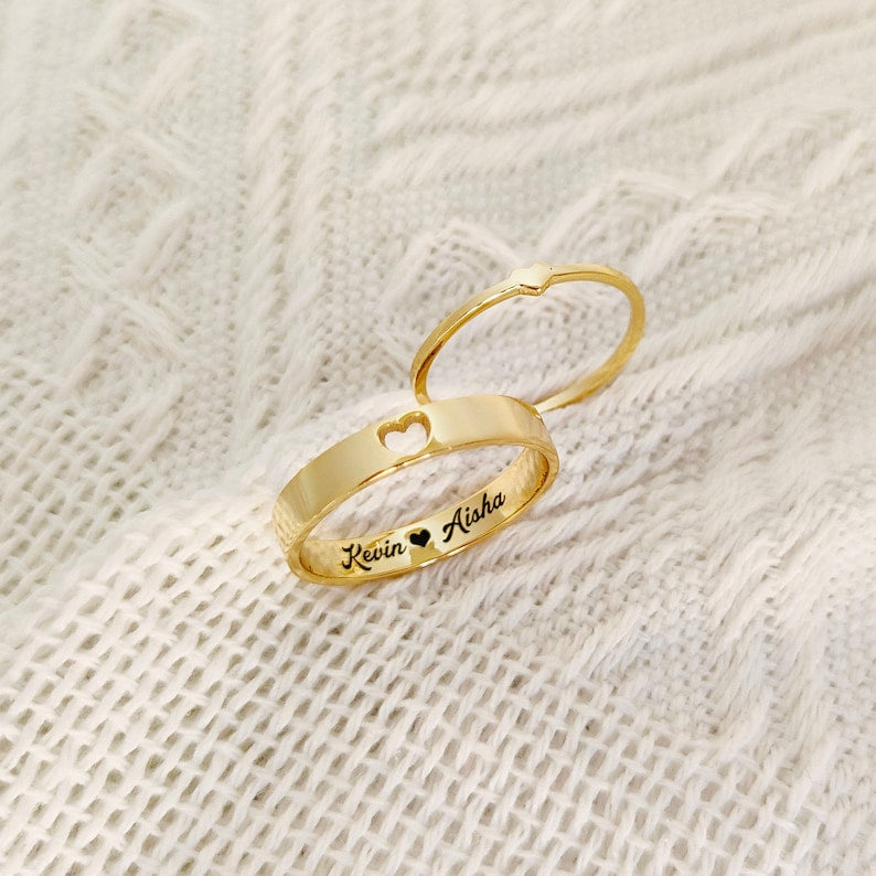 These custom couple rings are the perfect symbol of love and devotion. The heart initial adds a personalized touch, while the engravings on the inside hold special meaning to you and your partner. Made with high-quality materials, these rings are a luxurious expression of your love.