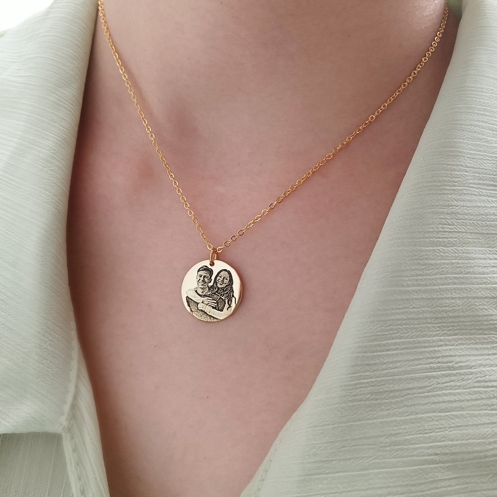 This personalized necklace features a photo engraved pendant, making it a unique and sentimental piece of jewelry. Crafted with precision and care, this necklace is a perfect way to showcase a special memory or loved one. Customize your style and cherish your memories with this stunning and personalized necklace.